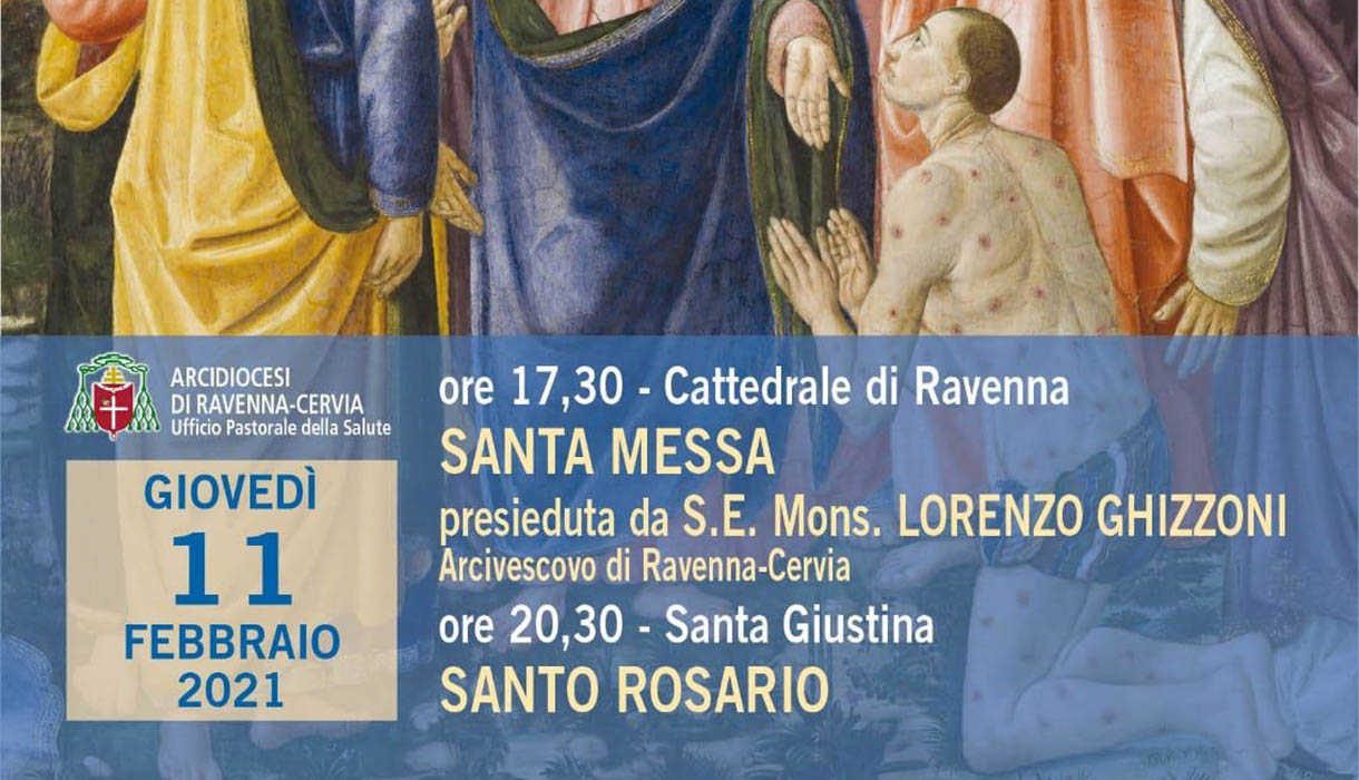 19 Gennaio 2021 admindiocesi Giovedì 11 febbraio: XXIX Giornata Mondiale del Malato. S. Messa in cattedrale alle 17.30 Giovedì 11 febbraio 2021: XXIX° Giornata Mondiale del Malato ore 17.30 Cattedrale di Ravenna Santa Messa presieduta da S.E. Mons. Lorenzo Ghizzoni, Arcivescovo di Ravenna-Cervia ore 20.30 rosario a Santa Giustina FacebookTwitterLinkedinPinterestPrintEmailWhatsapp Locandina Messaggio di Papa Francesco