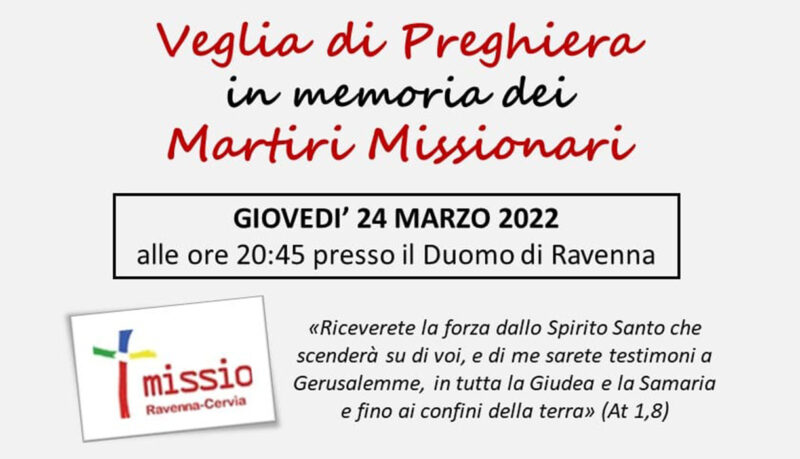 8 Febbraio 2022 admindiocesi Giovedì 24 marzo la Veglia di Preghiera per i Martiri Missionari Cattedrale di Ravenna Giovedì 24 marzo 2022, ore 20.45 Veglia di Preghiera in memoria dei Martiri Missionari FacebookTwitterLinkedinPinterestPrintEmailWhatsapp Volantino