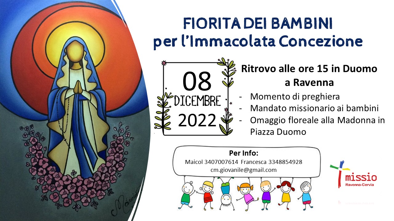 25 Agosto 2022 admindiocesi Giovedì 8 dicembre la Fiorita in Duomo Fiorita dei bambini per l’Immacolata Concezione Ritrovo alle 15 in Duomo a Ravenna Info e dettagli sul volantino FacebookTwitterLinkedinPinterestPrintEmailWhatsapp Volantino