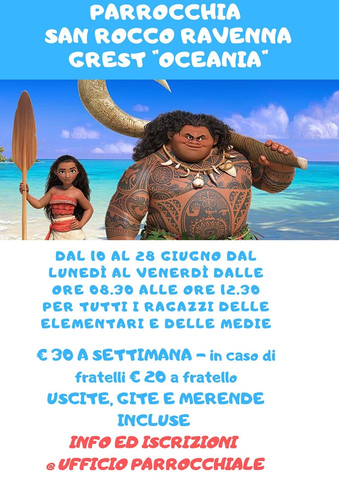 11 Giugno 2019 admindiocesi Grest a San Rocco: dal 10 al 28 giugno Parrocchia San Rocco Ravenna Grest “Oceania” Dal 10 al 28 giugno dal lunedì al venerdì dalle 8.30 alle 12.30 per tutti i ragazzi delle elementari e delle medie FacebookTwitterLinkedinPinterestPrintEmailWhatsapp