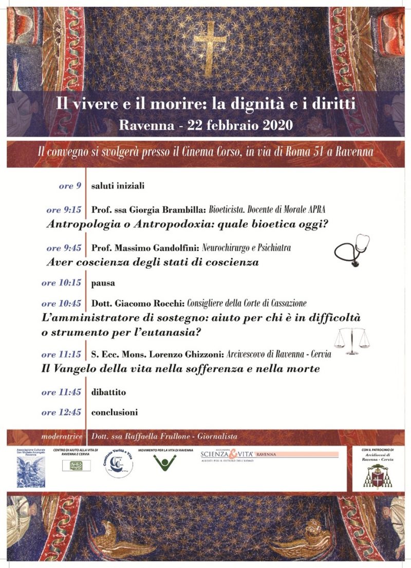 Sabato 22 febbraio dalle 9.00 presso il Cinema Corso, in via di Roma 51 a Ravenna, si svolgerà il  convegno “Il Vivere e il Morire: la dignità e i diritti”.