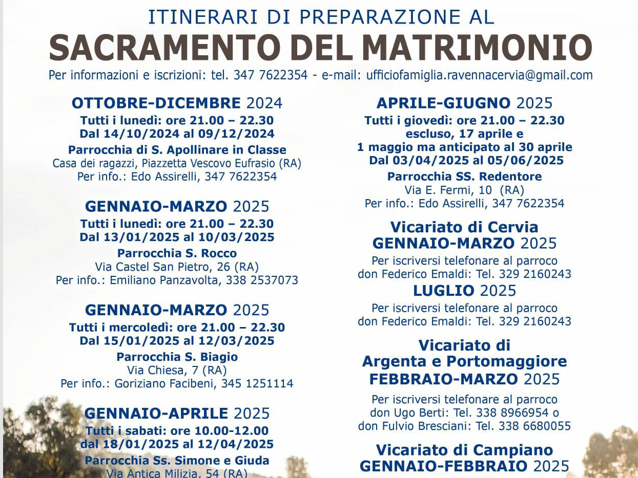 Per informazioni ed iscrizioni: tel. 347.7622354 – email: ufficio@pastoralefamiglia.ra.it