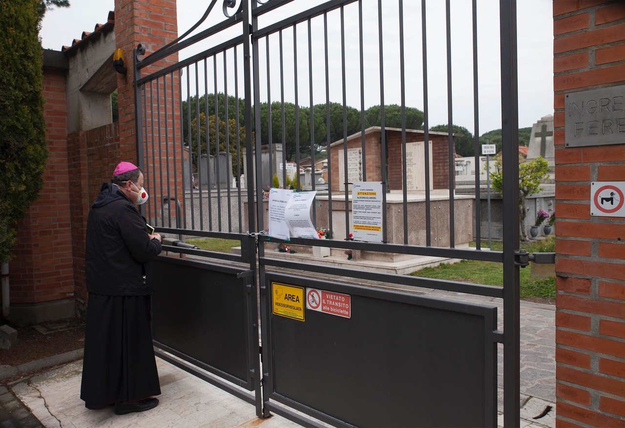 Di fronte ai cancelli del cimitero chiuso a causa dell’ordinanza provinciale per il contenimento del virus, monsignor Ghizzoni ha sostato in silenzio e ha recitato alcune preghiere in suffragio di tutti i defunti e in particolare di quelli causati dalla pandemia.