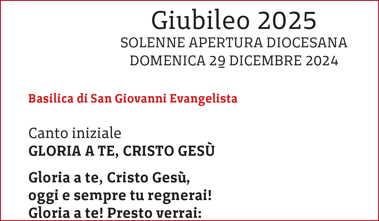 29 Dicembre 2024 admindiocesi Libretto celebrazione Giubileo 2025 SOLENNE APERTURA DIOCESANA DOMENICA 29 DICEMBRE 2024 Canto iniziale GLORIA A TE, CRISTO GESÙ Gloria a te, Cristo Gesù, oggi e sempre tu regnerai! Gloria a te! Presto verrai: sei speranza solo tu! (…) FacebookTwitterLinkedinPinterestPrintEmailWhatsapp Libretto
