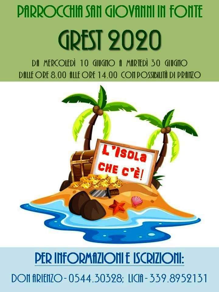 17 Giugno 2020 admindiocesi “L’isola che c’è” Al via il Grest del Duomo, dal 10 giugno al 3 luglio Parrocchia di San Giovanni in Fonte Da mercoledì 10 giugno a venerdì 3 luglio dalle 8 alle 14 con possibilità di pranzo Per informazioni e iscrizioni Don Arienzo tel. 0544.30328 Licia tel. 339.8952131 FacebookTwitterLinkedinPinterestPrintEmailWhatsapp