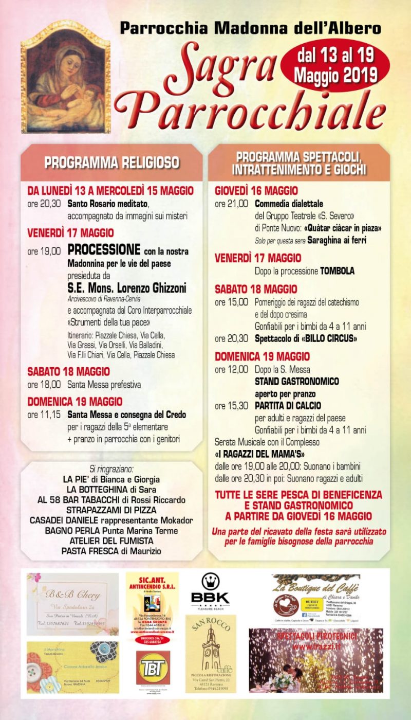 Sarà la processione per le vie del paese con l’effige della Madonna custodita in chiesa, presieduta da monsignor Lorenzo Ghizzoni, il culmine della Sagra parrocchiale di Madonna dell’Albero venerdì 17 maggio alle 19. Sarà accompagnata dal Coro interparrocchiale “Strumenti della tua pace”. La Sagra inizierà con un triduo dedicato al Rosario meditato (13-15 maggio ore 20.30). Altro momento religioso sarà domenica 19 alle 11.15 con la Messa e consegna del Credo ai ragazzi di quinta elementare. Fra gli intrattenimenti segnaliamo giovedì 16 alle 21 una commedia dialettale del Gruppo Teatrale “S. Severo” di Ponte Nuovo e sabato 18 alle 20.30 lo spettacolo di “Billo Circus”. Domenica 19 dopo la Messa sarà aperto lo stand gastronomico e alle 15.30 inizierà la partita di calcio per adulti e ragazzi del paese. La serata sarà allietata dal complesso musicale “Ragazzi del Mama’s”. Una parte del ricavato della festa sarà utilizzato per le famiglie bisognose.