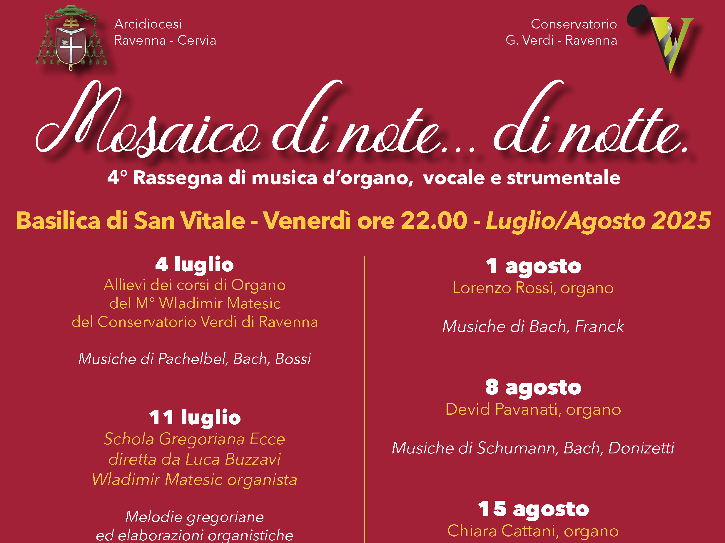 Torna la grande musica tra i mosaici di San Vitale. Terza edizione per “Mosaico di note… di notte”, la rassegna di musica d’organo, vocale e strumentale che animerà la basilica tutti i venerdì d’estate grazie alla convenzione tra la Diocesi di Ravenna-Cervia e il conservatorio Verdi di Ravenna.