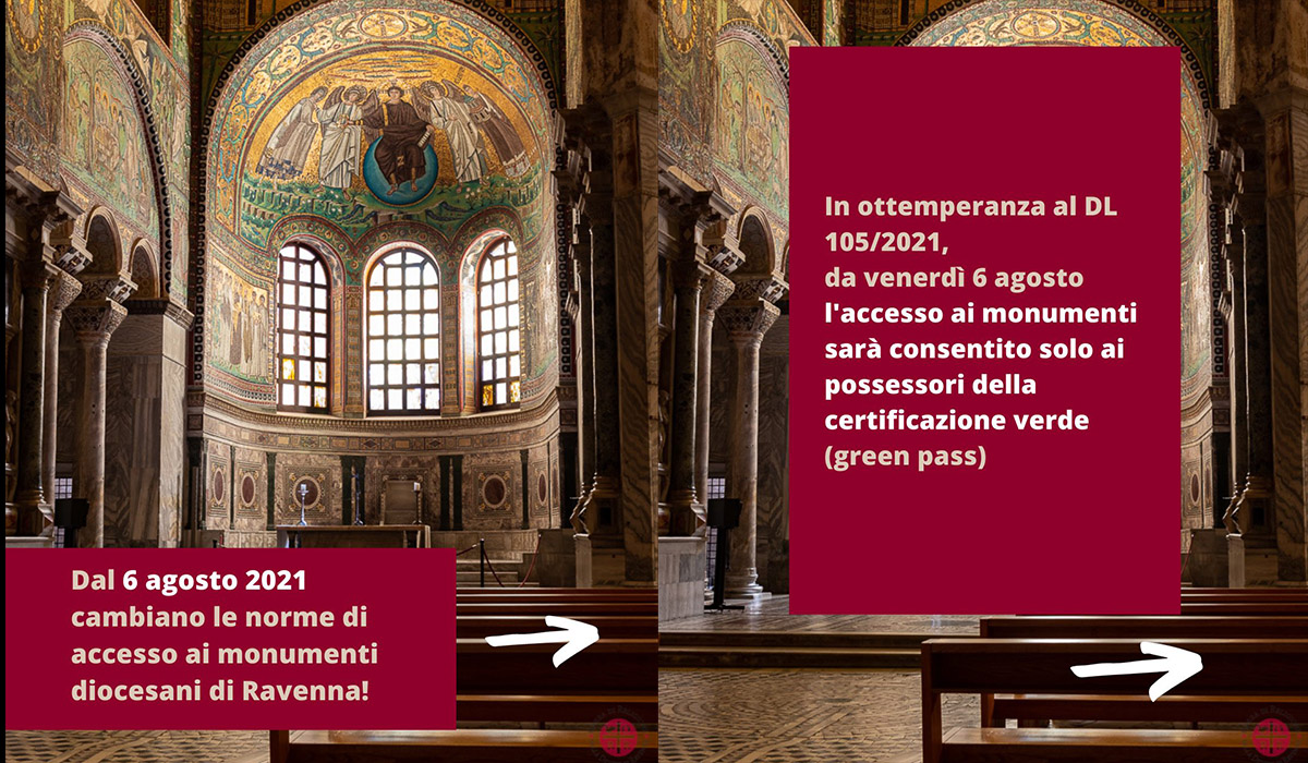 in compliance with current government regulations, from Friday ๐ ๐๐ฎ๐ ๐ฎ๐ฌ๐ญ ๐๐๐๐ the access to the diocesan monuments of Ravenna ๐ข๐ฌ ๐๐ฅ๐ฅ๐จ๐ฐ๐๐ ๐จ๐ง๐ฅ๐ฒ ๐ญ๐จ ๐ญ๐ก๐ ๐ก๐จ๐ฅ๐๐๐ซ๐ฌ ๐จ๐ ๐ญ๐ก๐ ๐๐ซ๐๐๐ง ๐๐๐ฌ๐ฌ (EU Digital COVID Certificate), accompanied by a valid identity document.