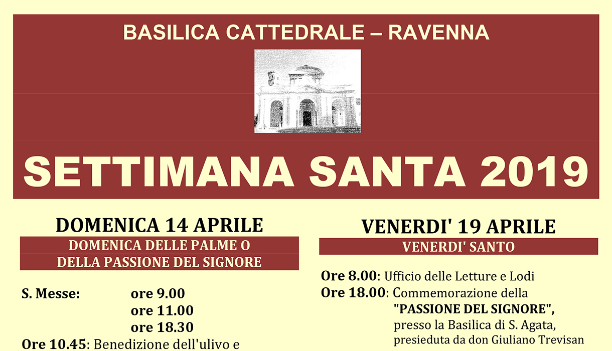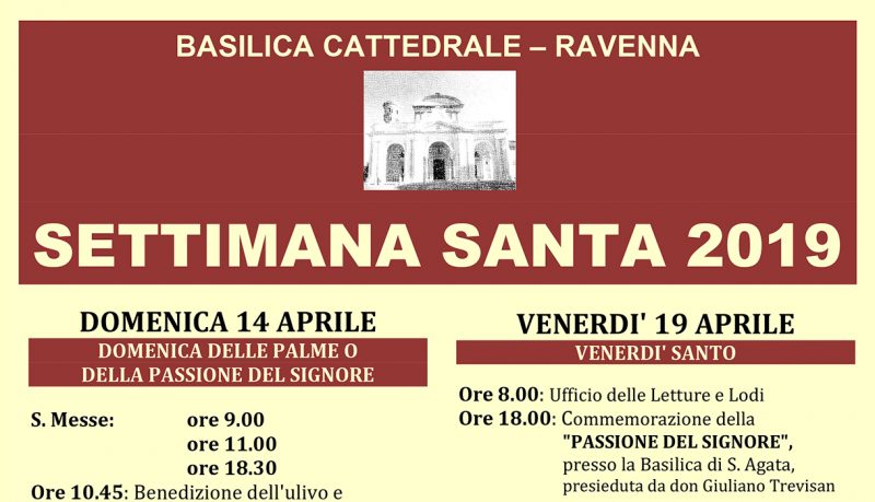 Il Triduo Pasquale quest’anno si celebra insieme per le tre parrocchie del centro storico. La Cattedrale, Sant’Agata e San Francesco ospiteranno infatti ciascuna una celebrazione del tradizionale Triduo di preparazione alla Santa Pasqua che quest’anno cade il 21 aprile. Dopo la Messa delle Palme, che ognuna delle tre parrocchie celebrerà secondo l’orario festivo, la Messa in Coena Domini del Giovedì Santo, 18 aprile, è in programma nella Basilica di San Francesco alle ore 18, presieduta dall’arcivescovo di Ravenna-Cervia, Monsignor Lorenzo Ghizzoni. Venerdì 19 aprile, a Sant’Agata, sempre alle 18 è in programma la Liturgia della Passione che sarà celebrata dal parroco di Sant’Agata, don Giuliano Trevisan. Monsignor Ghizzoni, invece, celebrerà la Passio nella Concattedrale di Cervia alle ore 15.30.