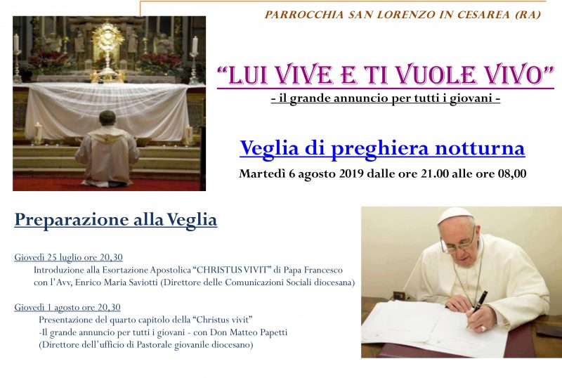 “Perché due incontri sulla ‘Christus Vivit’ e una veglia notturna di preghiera in piena estate? Proprio per scuotere i miei parrocchiani dal torpore estivo e offrire loro l’opportunità di partecipare: per fare formazione e per pregare con intensità il Signore”. Così don Ennio Rossi spiega il senso delle serate organizzate nella sua parrocchia di San Lorenzo in Cesarea: due giovedì (25 luglio e 1 agosto) di approfondimento dell’ultima esortazione apostolica di papa Francesco e poi, martedì 6 agosto, la veglia di preghiera notturna in chiesa intitolata “Lui vive e ti vuole vivo” (il grande annuncio per tutti i giovani).