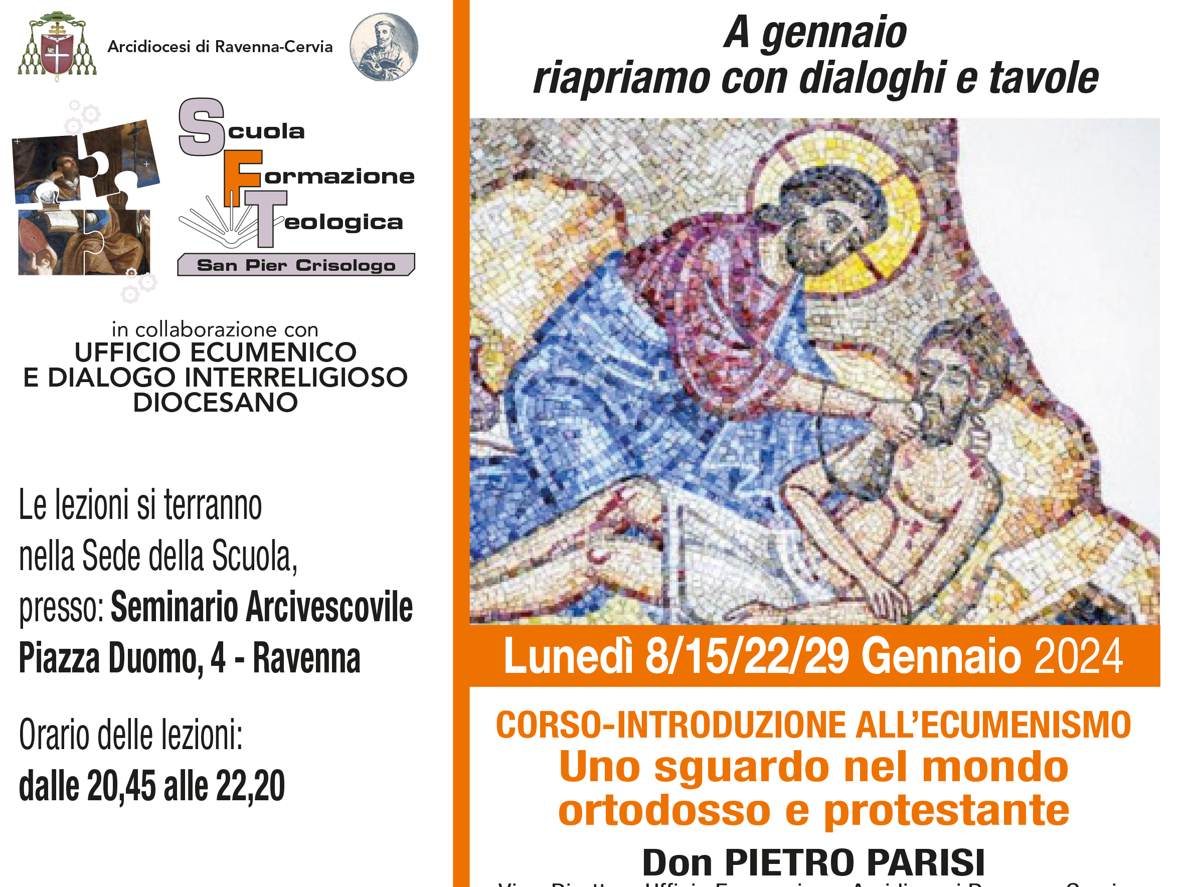 26 Ottobre 2023 admindiocesi SFT: Lunedì 29 gennaio “Introduzione all’Ecumenismo” con Don Pietro Parisi Lunedì 8/15/22/29 Gennaio 2024 Corso di Introduzione all’Ecumenismo Uno sguardo nel mondo ortodosso e protestante Don Pietro Parisi Vice-Direttore Ufficio Ecumenismo Arcidiocesi Ravenna-Cervia Info e dettagli sul volantino FacebookTwitterLinkedinPinterestPrintEmailWhatsapp Volantino