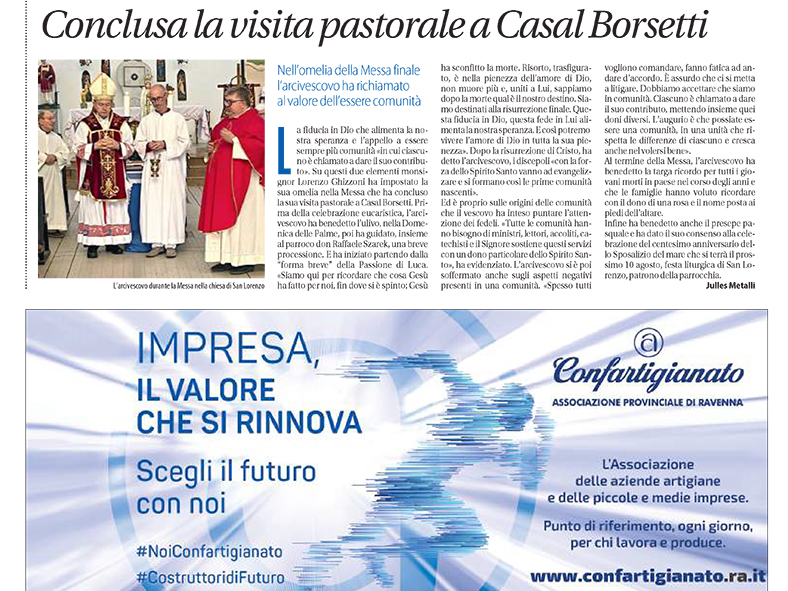 Conclusa a Casal Borsetti la visita pastorale dell’arcivescovo con un forte invito all’unità e alla corresponsabilità nella comunità. Al termine della Messa l’arcivescovo ha benedetto la targa ricordo per tutti i giovani morti in paese e il presepe pasquale (…) Chiusa la visita pastorale a Casal Borsetti. Monsignor Ghizzoni: “Siate comunità e mettete insieme i doni di Dio”