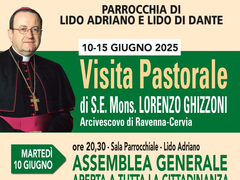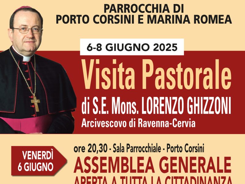 Parrocchia di S. Cuore, Porto Corsini Chiesa dell’Assunzione della B. V. M., Marina Romea 6-8 giugno 2025 Visita Pastorale di Mons. Lorenzo Ghizzoni, Arcivescovo di Ravenna-Cervia Tutto il programma sul volantino