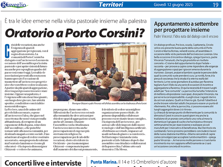 Crisi delle vocazioni, ma anche l’esigenza di spazi di aggregazione per i giovani, con il sogno di un oratorio. La comunità di Porto Corsini ha dialogato con l’arcivescovo Lorenzo ieri sera in occasione dell’assemblea per la visita pastorale e per aprire visioni di futuro ma anche per esporgli un quadro del paese così come è oggi. Visita pastorale a Porto Corsini. La comunità del lido sogna … Continue reading Visita pastorale a Porto Corsini. La comunità del lido sogna un oratorio e chiede più spazi di aggregazione