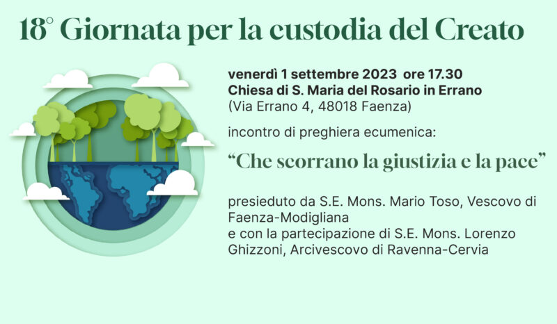 il prossimo 1 settembre 2023, alle ore 17.30, nella parrocchia di Santa Maria del Rosario in Errano – Faenza (Via Errano n. 4) si svolgerà la 18° Giornata per la Custodia del Creato, che quest’anno ha come tema: “Che scorrano la giustizia e la pace”. Sarà, come tradizione, un incontro di preghiera ecumenica seguita da un buffet.
