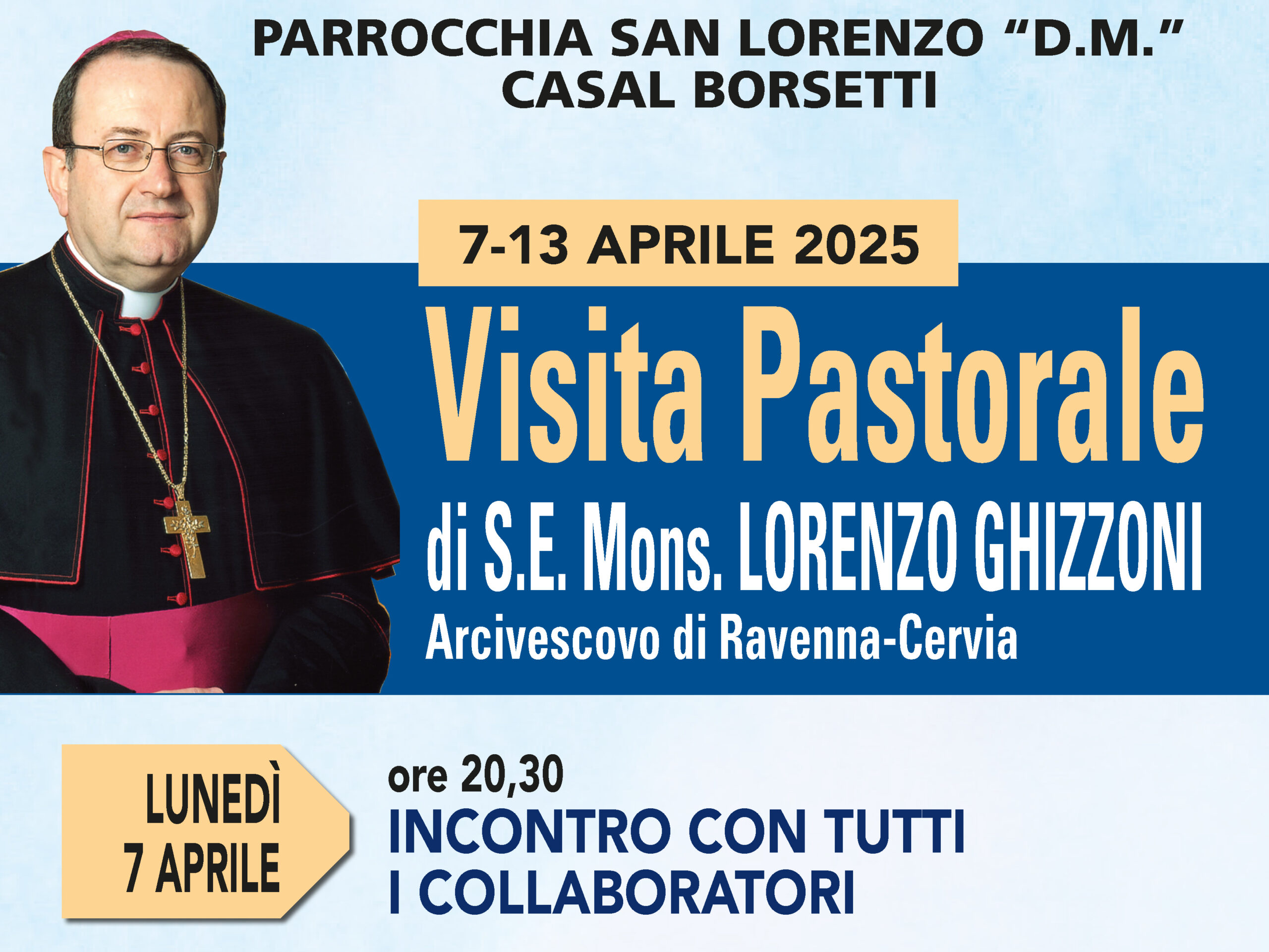 18 Marzo 2025 admindiocesi Visita Pastorale 2019-2025 – 7-13 aprile 2025 – Casal Borsetti Vicariato di Marina di Ravenna Parrocchia di S. Lorenzo, Casal Borsetti 7-13 aprile 2025 Visita Pastorale di Mons. Lorenzo Ghizzoni, Arcivescovo di Ravenna-Cervia Tutto il programma sul volantino FacebookTwitterLinkedinPinterestPrintEmailWhatsapp Visita Pastorale - 7-13 aprile 2025 - Casal Borsetti