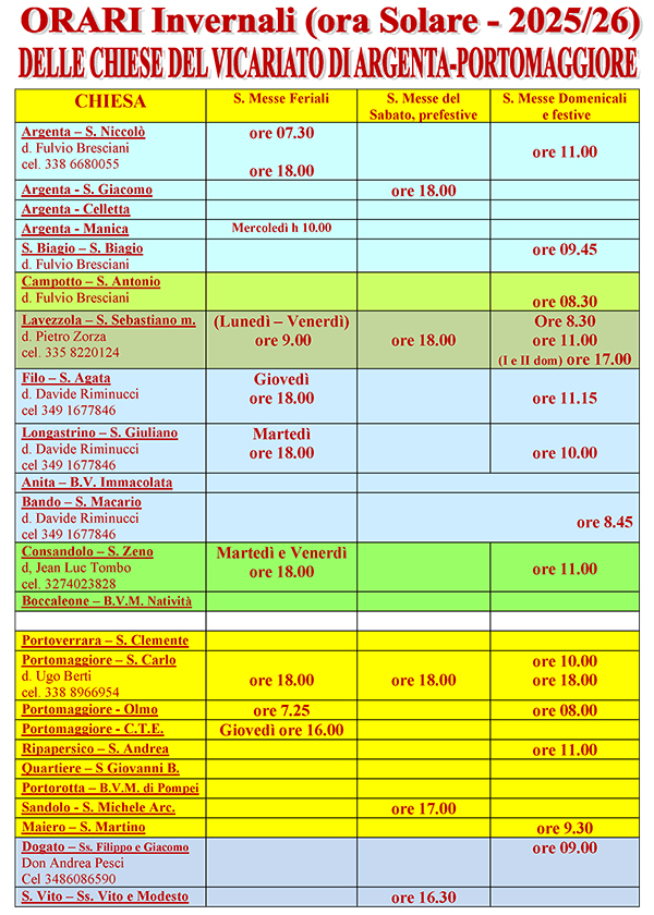 20/02/202320/10/2025Orari SS. Messe – Vicariato di Argenta-Portomaggiore Vicariato di Argenta-Portomaggiore – Orari invernali (ora Solare 2025-2026)