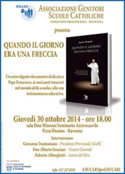 E’ per questo motivo che il comitato provinciale AGeSC – Associazione Genitori Scuole Cattoliche, invita tutti coloro che si sentono protagonisti nella scuola a partecipare all’incontro di presentazione del libro “Quando il giorno era una freccia” di Roberto Alborghetti, che racconta ciò che il papa in quella giornata ha soltanto accennato: la sua esperienza della scuola, da studente, insegnante e vescovo.