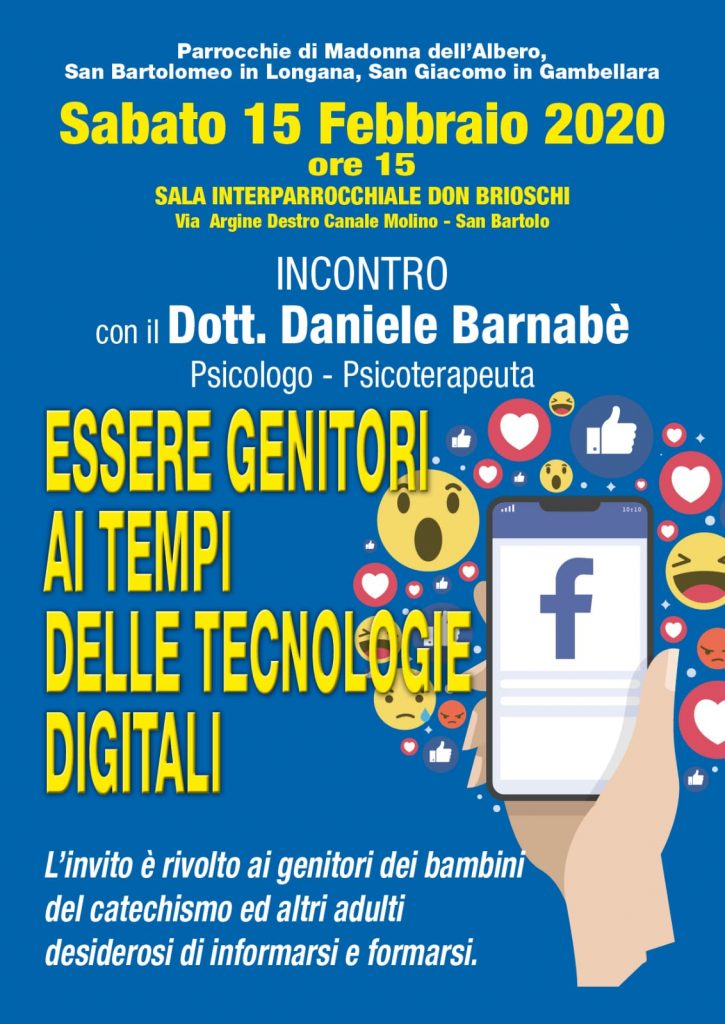 Sabato 15 febbraio 2020 alle ore 15, presso la sala interparrocchiale Don Brioschi, a San Bartolo in via Argine Destro Canale Molino, si terrà l’incontro “Essere genitori ai tempi delle tecnologie digitali” con il dott. Daliele Bernabè, psicologo e psicoterapeuta.