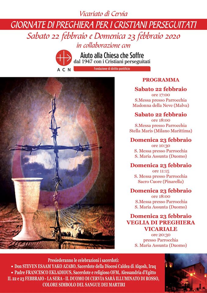 Sabato 22 e domenica 23 febbraio 2020, le parrocchie del Vicariato di Cervia accoglieranno Padre Francesco Ekladious (OFM, Alessandria d’Egitto) e Don Steven Azabo (Diocesi di Alqosh, Iraq) per due giornate di preghiera per i cristiani perseguitati.