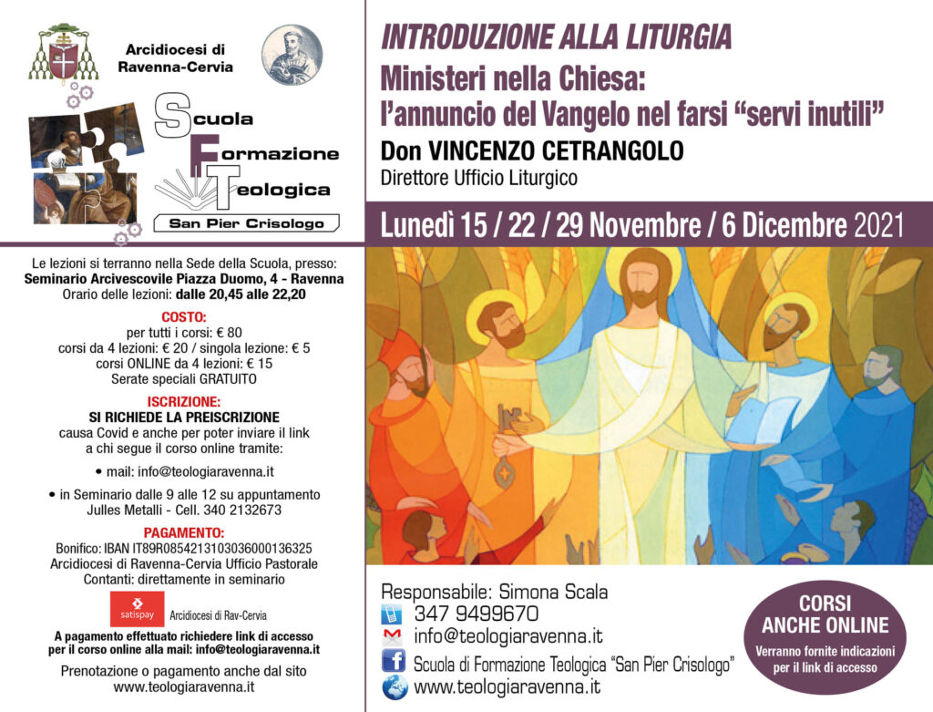 Lunedì 6 dicembre si terrà l’ultima lezione del corso di “Introduzione alla Liturgia” alla Scuola di Formazione Teologica “San Pier Crisologo” con Don Vincenzo Cetrangolo. Le lezioni si terranno dalle 20.45 alle 22.20 nella sede della scuola, presso il Seminario Arcivescovile in piazza Duomo 4 a Ravenna.