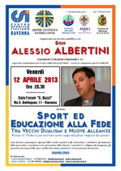 Ma la prima grande sorpresa, Azione Cattolica diocesana e Csi di Ravenna ce la propongono venerdì prossimo 12 aprile, quando alle 20.30 presso la Sala ‘Forum’ della Seconda Circoscrizione (Via Berlinguer, 11) si terrà un incontro pubblico che le due associazioni hanno organizzato ospitando Don Alessio Albertini, che non solo è Consulente Ecclesiastico nazionale del Csi e Segretario della Commissione Sport nella Diocesi di Milano, ma che tutti conoscono come commentatore sportivo della Rai e brillante scrittore oltre che come fratello del grande campione di calcio Demetrio. Il tema dell’incontro sarà: ‘Sport ed Educazione alla Fede: tra vecchi dualismi e nuove alleanze – Riscoprire l’Oratorio parrocchiale come luogo educativo integrale dei giovani’.
