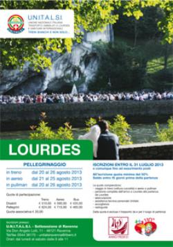 Si chiuderanno il 31 luglio le iscrizioni al Pellegrinaggio a Lourdes promosso dall’Unitalsi. Le modalità di partecipazione sono tre: in treno dal 20 al 26 agosto; in aereo dal 21 al 25 agosto; in pullman dal 20 al 26 agosto. Le iscrizioni si ricevono presso l’Unitalsi ‘ Sottosezione di Ravenna, in via Don Angelo Lolli, 11 Ravenna, tel/fax 054438170, unitalsiravenna@libero.it.