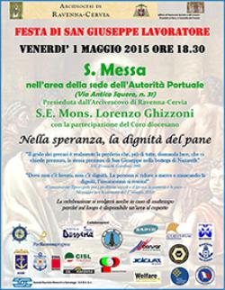La Celebrazione Eucaristica della festa di S. Giuseppe lavoratore, presieduta da S.E. mons. Lorenzo Ghizzoni, si svolgerà in Darsena di città, all’interno dell’area ove è ubicata la sede dell’Autorità Portuale di Ravenna (Via Antico Squero n. 31), in un luogo fortemente rappresentativo del lavoro e dell’economia ravennate, venerdì 1° maggio 2015 alle ore 18.30 grazie alle seguenti collaborazioni: Autorità Portuale di Ravenna; Compagnia Portuale di Ravenna che ha curato l’organizzazione logistica; Ciclat; Cral;Portuali Ravenna; Sapir; Consar; Naviga in Darsena; Propeller Club Porto of Ravenna; Port Ravenna Progress; Welfare Gente di Mare – Stella Maris; Associazione Agenti Marittimi di Ravenna; Piloti del Porto; Ormeggiatori del Porto; Sers; Micoperi; Bambini; Associazione ANMI; sindacati CGIL/CISL/UIL.